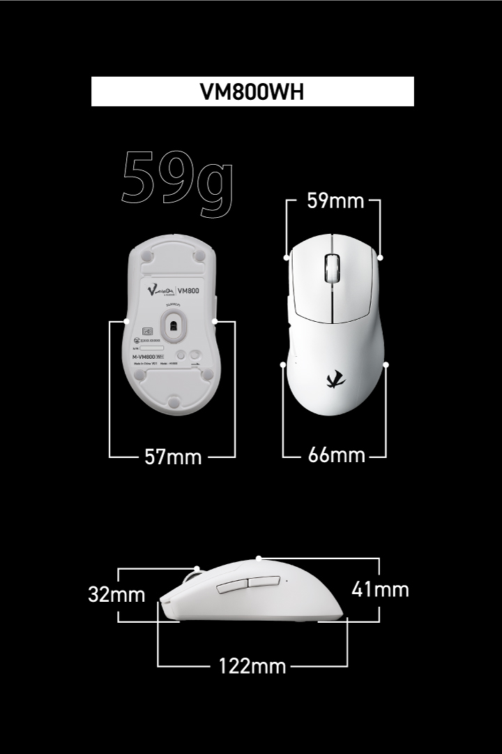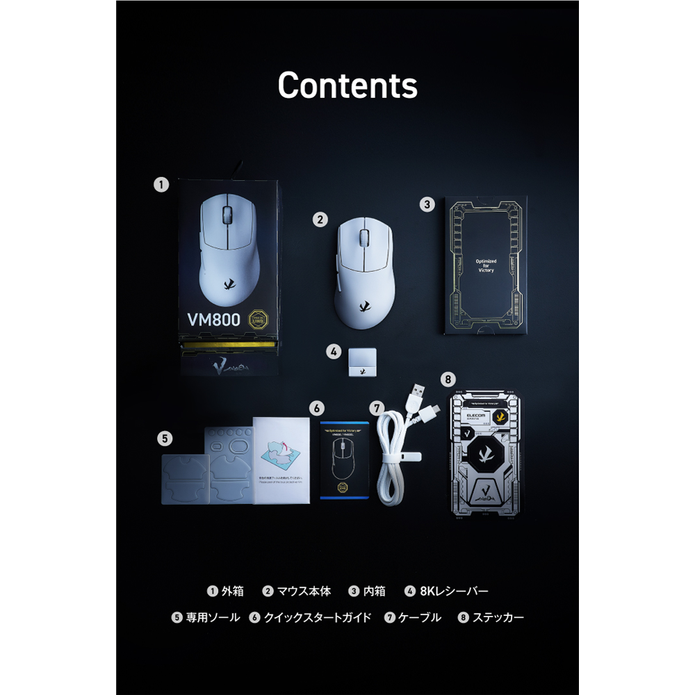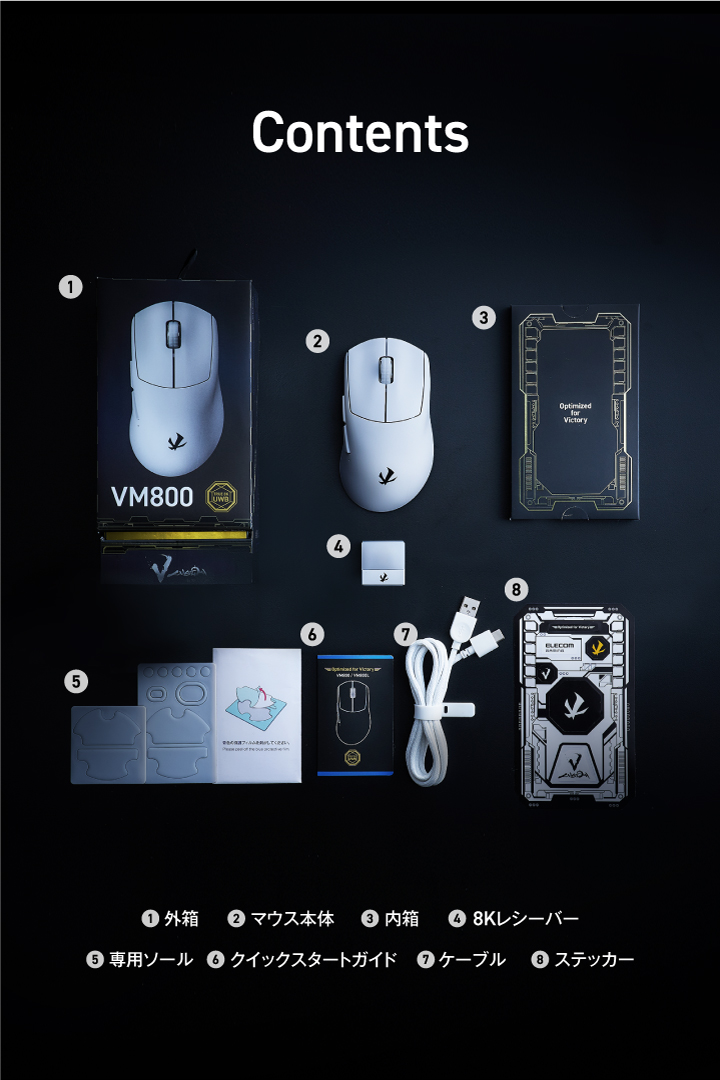 内容物 | VM800本体、8Kレシーバー、ケーブル(約1.5m)、交換用ソール×2組、ステッカー、クイックスタートガイド |