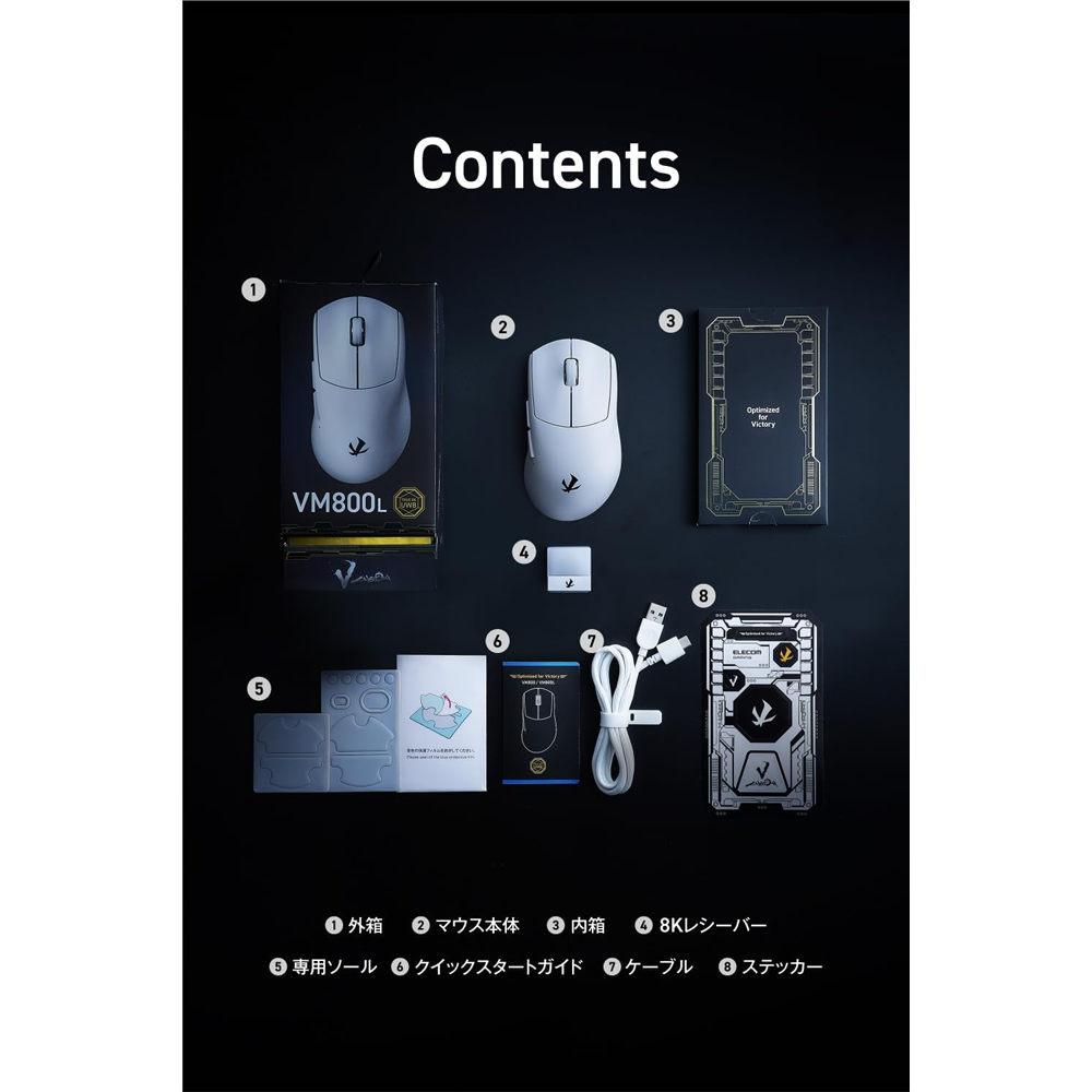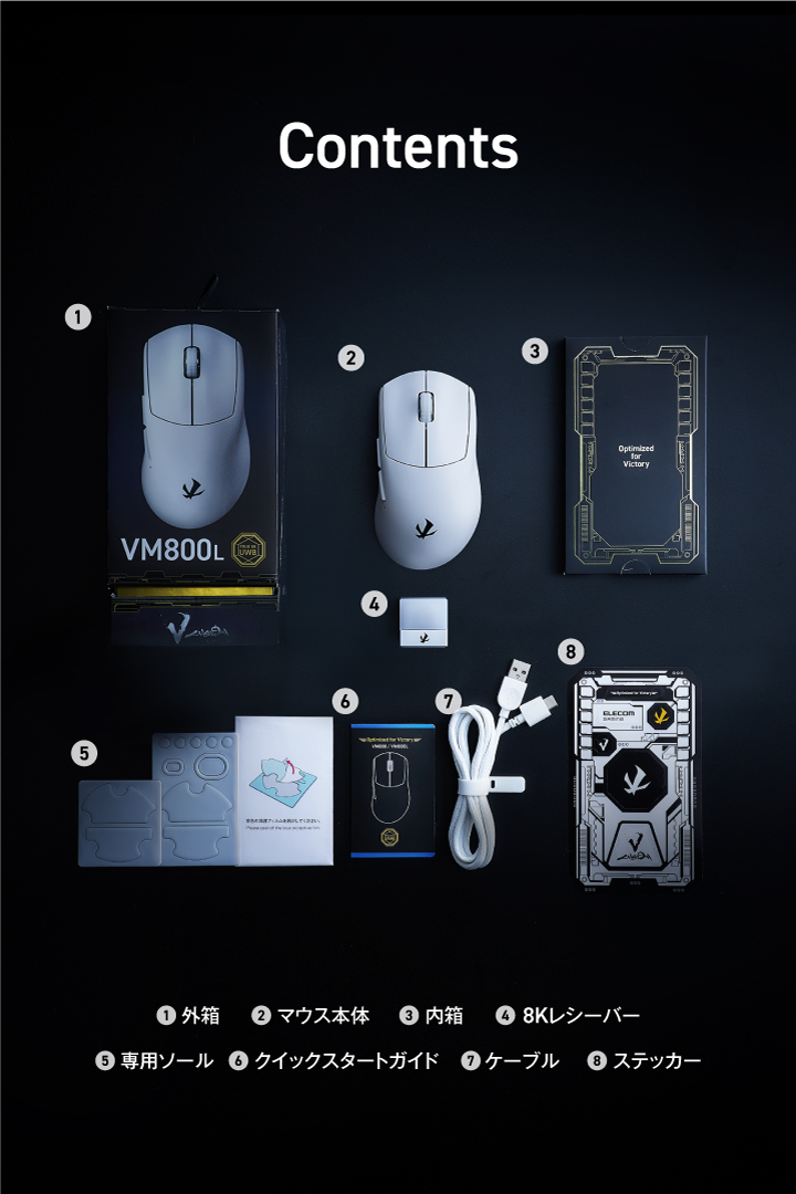 内容物 | VM800本体、8Kレシーバー、ケーブル(約1.5m)、交換用ソール×2組、ステッカー、クイックスタートガイド |